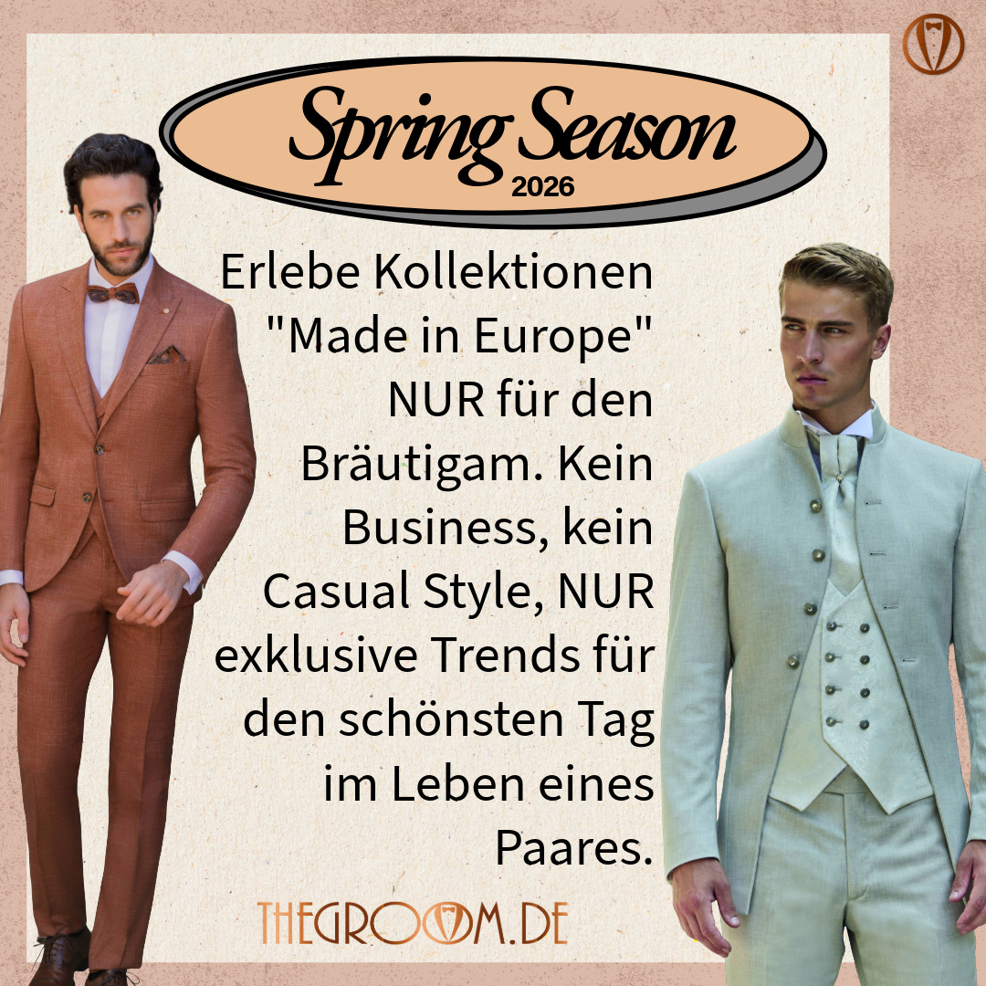 Es ist endlich soweit! Die neue Spring Season 2026 ist da! Vereinbare Jetzt deinen persönlichen Beratungstermin und erlebe 2 kostenlose Stunden voller exklusiver Outfits, einzigartiger Designs, unzähligen Möglichkeiten und einer fachkundigen und vor allem ehrlichen Beratung! Erlebe 30 Jahre geballte Expertise Nur für den Bräutigam bei The Groom Fashion in Düsseldorf!